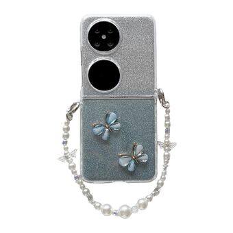 For Huawei P50 Pocket Glitter Powder 3D Butterfly PC Side Buckle Full Coverage Shockproof Phone Case with Pearl Bracelet(Blue)