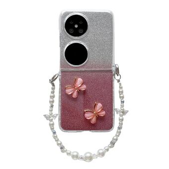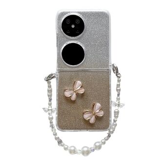 For Huawei P50 Pocket Glitter Powder 3D Butterfly PC Side Buckle Full Coverage Shockproof Phone Case with Pearl Bracelet(Gold)