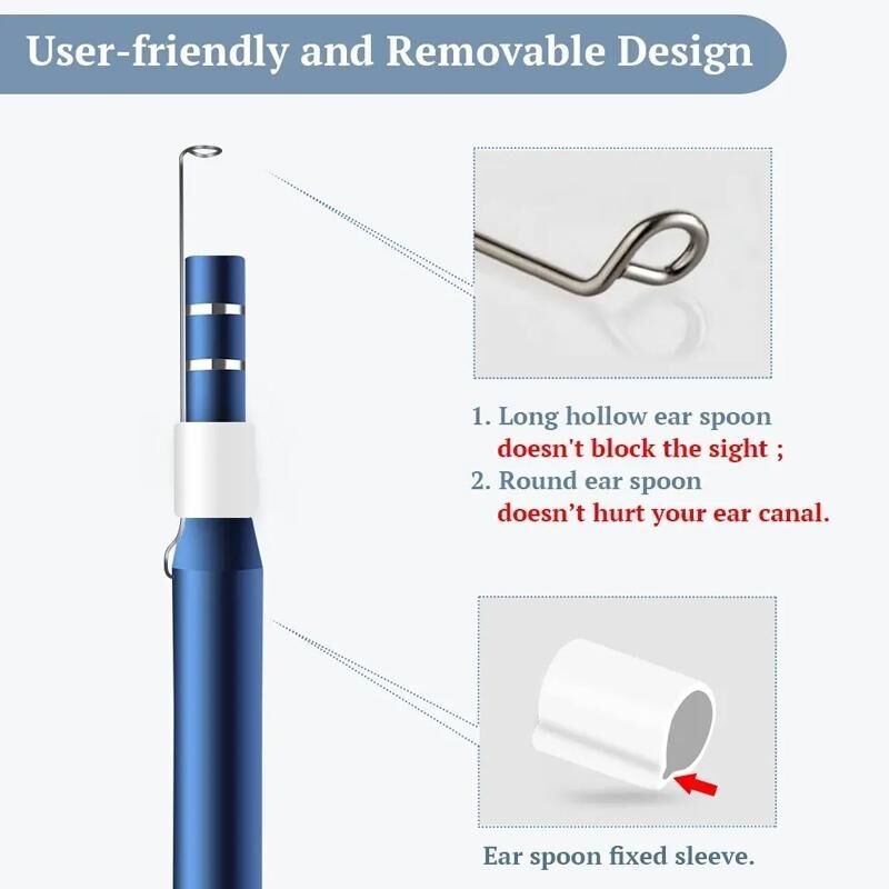 Αυτό είναι ένα εργαλείο καθαρισμού ακουστικού πόρου με οπτική εικόνα HD που περιλαμβάνει μια μίνι κάμερα με διάμετρο 5,5 mm και μερικά εναλλάξιμα αξεσουάρ, όπως επιλογή αυτιού, επιλογή αυτιού με κόλλα, επιλογή αυτιού με μπατονέτα, ωτοασπίδες. Οι εικόνες μπορούν να εμφανιστούν και να αποθηκευτούν στα τηλέφωνά σας ή στους υπολογιστές σας.