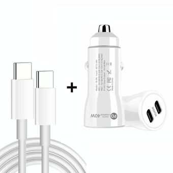 TE-P8 40W PD20W + PD20W Dual Port PD3.0 Car Charger with Type-c to Type-C Data Cable, Length: 1m(White)