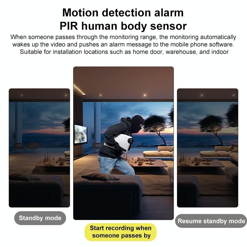 6. Motion detection alarm, PIR human body sensing: when someone passes through the monitoring range, the monitoring automatically calls the video and pushes the alarm message to the mobile phone software, which is suitable for watching the door of the house, the warehouse, the indoor installation location, etc.