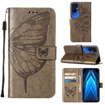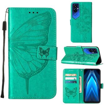 Θήκη τηλεφώνου Tecno Pova 4 Pro LG8N με ανάγλυφο σχέδιο πεταλούδας, δερμάτινη, τύπου flip (Μπλε)