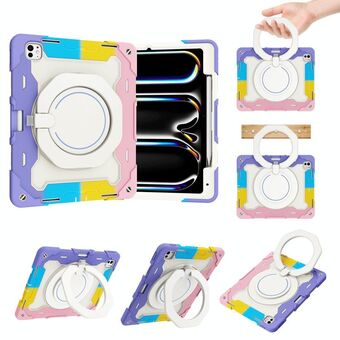 For iPad Pro 13 2024 Armor Portable Rotating Ring Holder Silicone Tablet Case with Pen Slot(Colorful Pink)