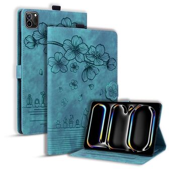 For iPad Pro 13 2024 Cartoon Sakura Cat Embossed Smart Leather Tablet Case(Blue)