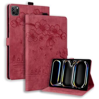For iPad Pro 13 2024 Cartoon Sakura Cat Embossed Smart Leather Tablet Case(Red)