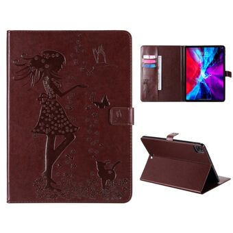 For iPad Pro 12.9 (2020) Pressed Printing Woman and Cat Pattern Horizontal Flip Leather Tablet Case with Holder & Card Slots & Wallet(Coffee)