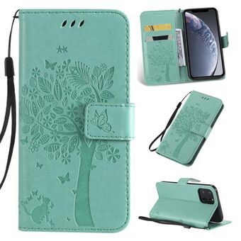For iPhone 11 Tree & Cat Pattern Pressed Printing Horizontal Flip PU Leather Case with Holder & Card Slots & Wallet & Lanyard (Green)