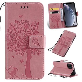 For iPhone 11 Tree & Cat Pattern Pressed Printing Horizontal Flip PU Leather Case with Holder & Card Slots & Wallet & Lanyard (Pink)