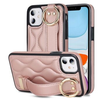 For iPhone 11 Non-slip Full Coverage Ring PU Phone Case with Wristband(Rose Gold)
