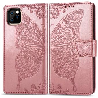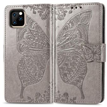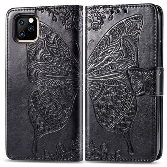 Θήκη δέρματος οριζόντιας αναδίπλωσης για iPhone 11 με σχέδιο πεταλούδας, λουλούδια και ανάγλυφο, με βάση, θήκες καρτών, πορτοφόλι και κορδόνι (Μαύρο)