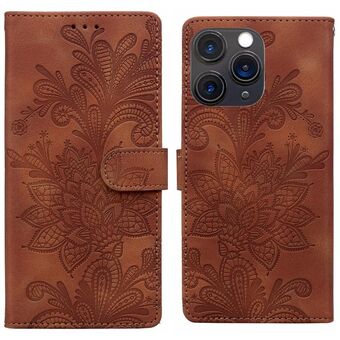 For iPhone 11 Pro Max Lace Floral Embossed Magnetic Buckle PU Phone Case With Wrist Strap(Brown)