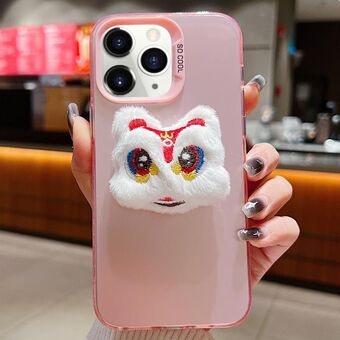 For iPhone 11 Pro Max New Year Lion Dance Plush Doll Phone Case(Pink Back White Lion)