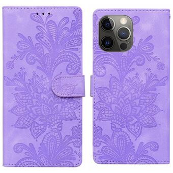 For iPhone 11 Pro Lace Floral Embossed Magnetic Buckle PU Phone Case With Wrist Strap(Purple)