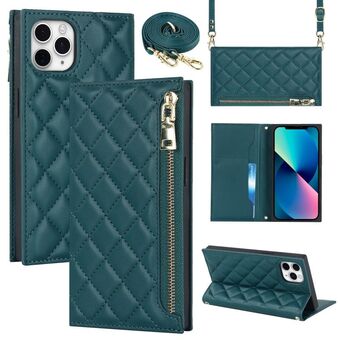 For iPhone 11 Pro Grid Texture Lanyard Zipper Leather Phone Case(Green)