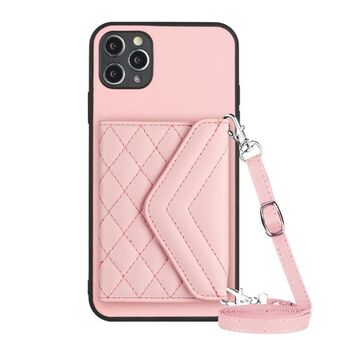 For iPhone 11 Pro Rhombic Texture Card Bag RFID Phone Case with Long Lanyard(Rose Gold)