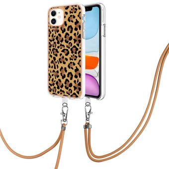 For iPhone 11 Cat Ear Leopard Print TPU Straight Edge Protective Case with Lanyard (Brown)