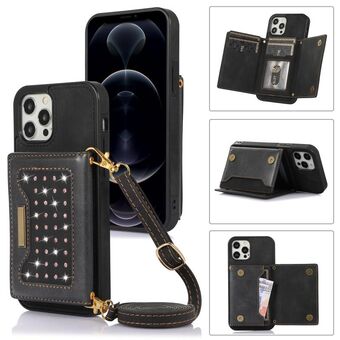 Θήκη τηλεφώνου από δέρμα με προστασία RFID για iPhone 12, τριπλή, με κορδόνι (Μαύρο)
