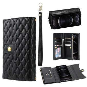 Θήκη τηλεφώνου από δέρμα με ρομβικό σχέδιο και πολλαπλές θήκες καρτών με φερμουάρ για iPhone 12 / 12 Pro (Μαύρο)