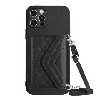 For iPhone 12 Pro Rhombic Texture Card Bag RFID Phone Case with Long Lanyard(Black)