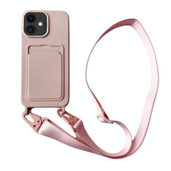 For iPhone 12 Card Slot Liquid Silicone Phone Case with Lanyard(Light Pink)