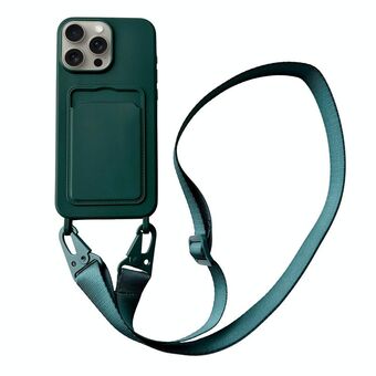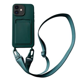 For iPhone 12 Card Slot Liquid Silicone Phone Case with Lanyard(Dark Green)