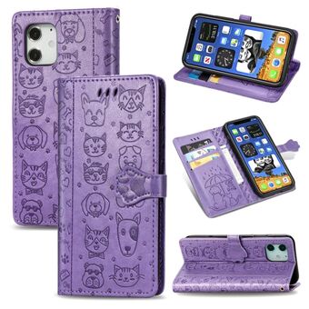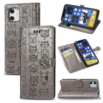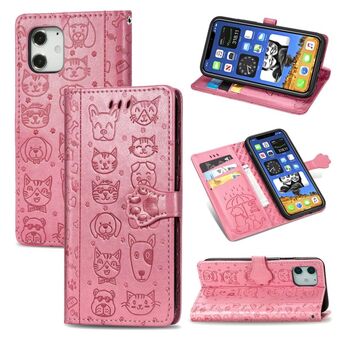 Θήκη δέρματος οριζόντιας αναδίπλωσης για iPhone 12 / 12 Pro με χαριτωμένο ανάγλυφο σχέδιο γάτας και σκύλου, με βάση, θήκες καρτών, πορτοφόλι και λουρί (Ροζ)