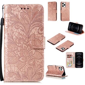 For iPhone 12 / 12 Pro Lace Flower Horizontal Flip Leather Case with Holder & Card Slots & Wallet & Photo Frame(Rose Gold)