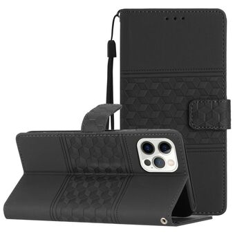 For iPhone 12 Pro Diamond Embossed Skin Feel Leather Phone Case with Lanyard(Black)