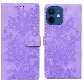 For iPhone 12 mini / 13 mini Lace Floral Embossed Magnetic Buckle PU Phone Case With Wrist Strap(Purple)