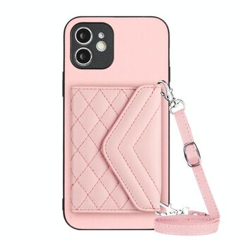 For iPhone 12 mini Rhombic Texture Card Bag RFID Phone Case with Long Lanyard(Rose Gold)