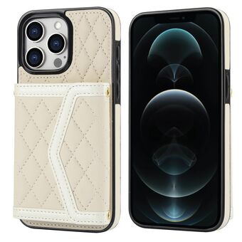 For iPhone 12 Pro Max Splicing Rhombic Texture Card Bag Phone Case with Long Lanyard(Beige)