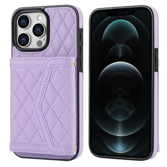 For iPhone 12 Pro Max Splicing Rhombic Texture Card Bag Phone Case with Long Lanyard(Purple)