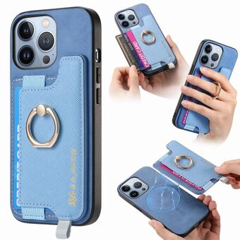 For iPhone 13 Pro Retro Magsafe Cross Leather Ring Holder Card Bag Phone Case(Blue)