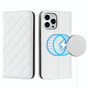 For iPhone 13 Pro Rhombic MagSafe RFID Anti-Theft Wallet Leather Phone Case(White)