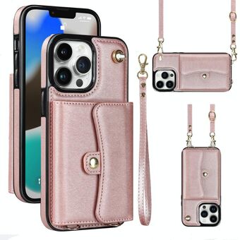 For iPhone 13 Pro RFID Card Slot Phone Case with Long Lanyard(Rose Gold)