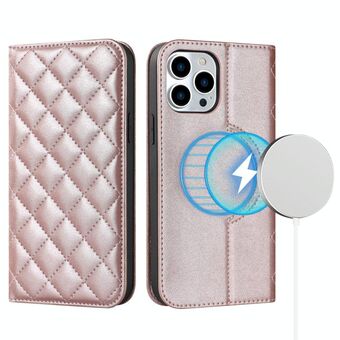 For iPhone 13 Pro Rhombic MagSafe RFID Anti-Theft Wallet Leather Phone Case(Rose Gold)