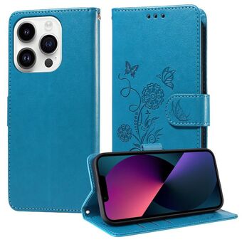 For iPhone 13 Pro Max Embossed Butterfly Flowers Leather Phone Case(Blue)