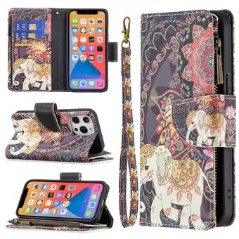 For iPhone 13 Pro Max Colored Drawing Pattern Zipper Horizontal Flip Leather Case with Holder & Card Slots & Wallet (Flower Elephants)