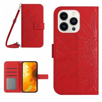 Θήκη τηλεφώνου από δέρμα με σχέδιο ηλιοτρόπιου και αίσθηση δέρματος για iPhone 13 Pro Max, τύπου flip με κορδόνι (Κόκκινο)