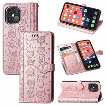 For iPhone 13 Pro Max Cute Cat and Dog Embossed Horizontal Flip Leather Case with Holder & Card Slots & Wallet & Lanyard (Rose Gold)