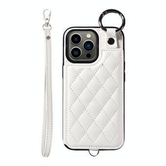 For iPhone 13 Pro Rhombic Texture Card Bag Phone Case with Short Lanyard(White)