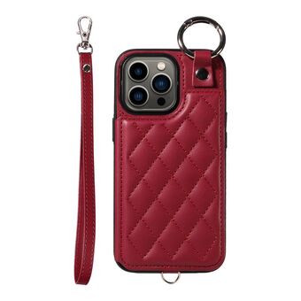 For iPhone 13 Pro Rhombic Texture Card Bag Phone Case with Short Lanyard(Wine Red)