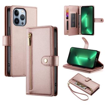 For iPhone 13 Pro Max Solid Color Zipper 11-Card Slots Bag Phone Case with Lanyard(Rose Gold)