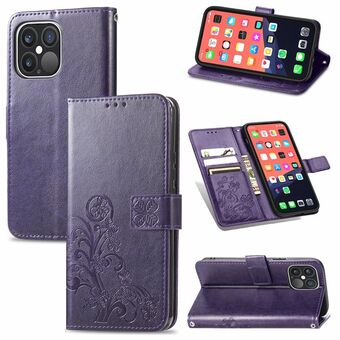 For iPhone 13 Pro Four-leaf Clover Clasp Embossed Buckle Mobile Phone Protection Leather Case with Lanyard & Card Slot & Wallet & Bracket Function(Purple)