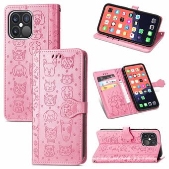 For iPhone 13 Pro Cute Cat and Dog Embossed Horizontal Flip Leather Case with Holder & Card Slots & Wallet & Lanyard (Pink)