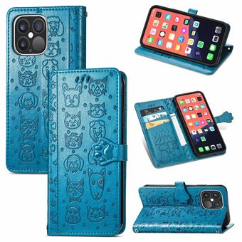For iPhone 13 Pro Cute Cat and Dog Embossed Horizontal Flip Leather Case with Holder & Card Slots & Wallet & Lanyard (Blue)
