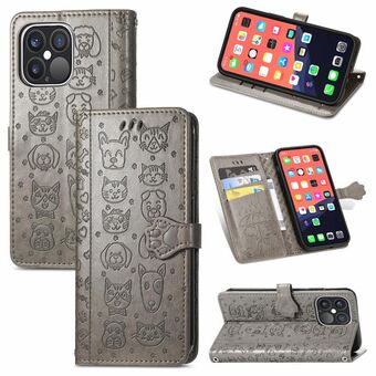 For iPhone 13 Pro Cute Cat and Dog Embossed Horizontal Flip Leather Case with Holder & Card Slots & Wallet & Lanyard (Gray)