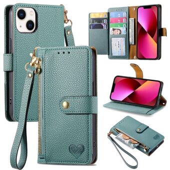 For iPhone 13 Love Zipper Lanyard Leather Phone Case(Green)