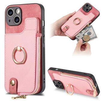 For iPhone 13 Cross Leather Ring Vertical Zipper Wallet Back Phone Case(Pink)