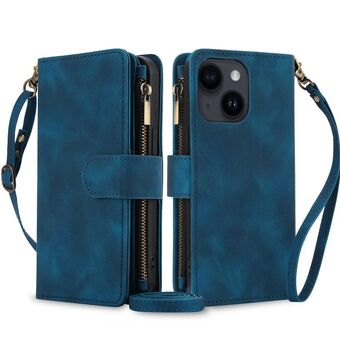 Θήκη κινητού τηλεφώνου από δέρμα με προστασία RFID και φερμουάρ για iPhone 13 Dream, χωρητικότητας 9 καρτών, με κορδόνι (Μπλε)